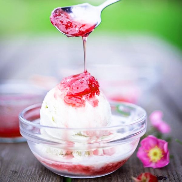 Reducción con pétalos de Rosas Orgánicos. Cada Pétalo de Rosa se encuentra macerado por dias en azahar y agua de Rosas de Nuestro Rosal. Ideal para degustar con queso crema en tostaditas, sobre queso Brie ó Camembert, para relleno de crepes, tartaletas ó pasteles,